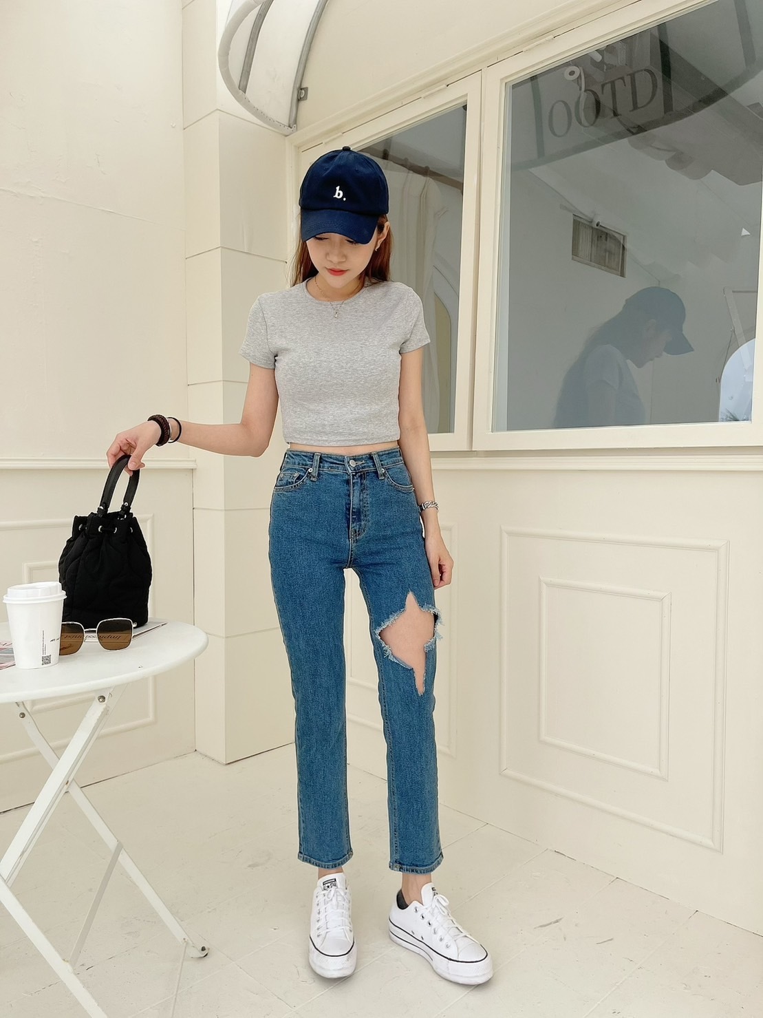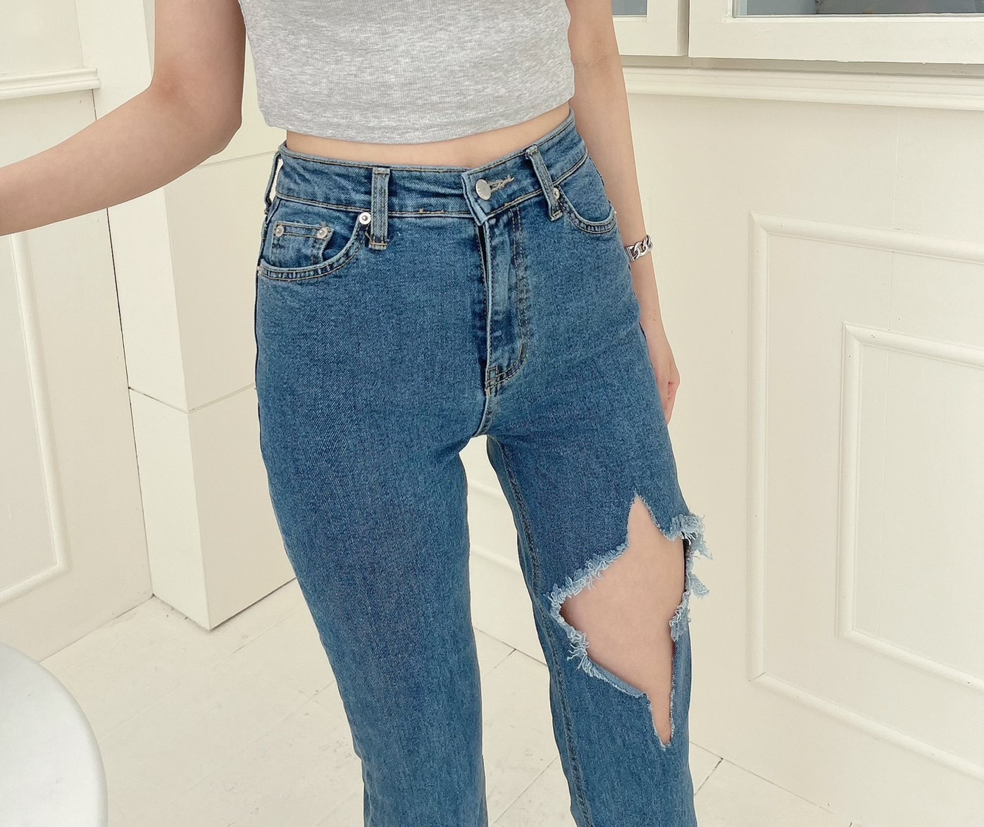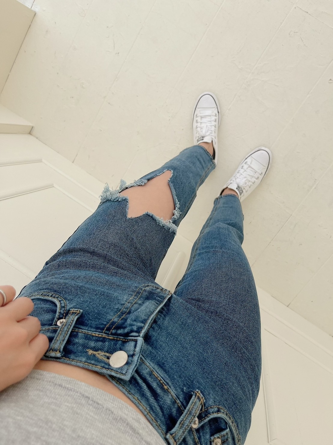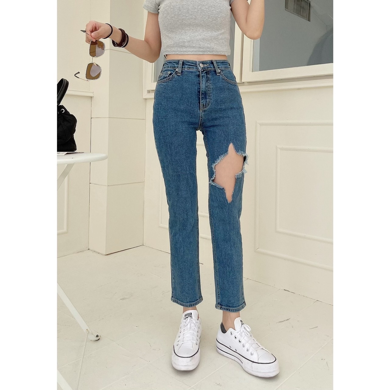 🔥02.08直播新品]💥3.0爆瘦誇張褲]🇰🇷正韓高腰超顯瘦彈性左破洞貼腿直筒褲(S-L)