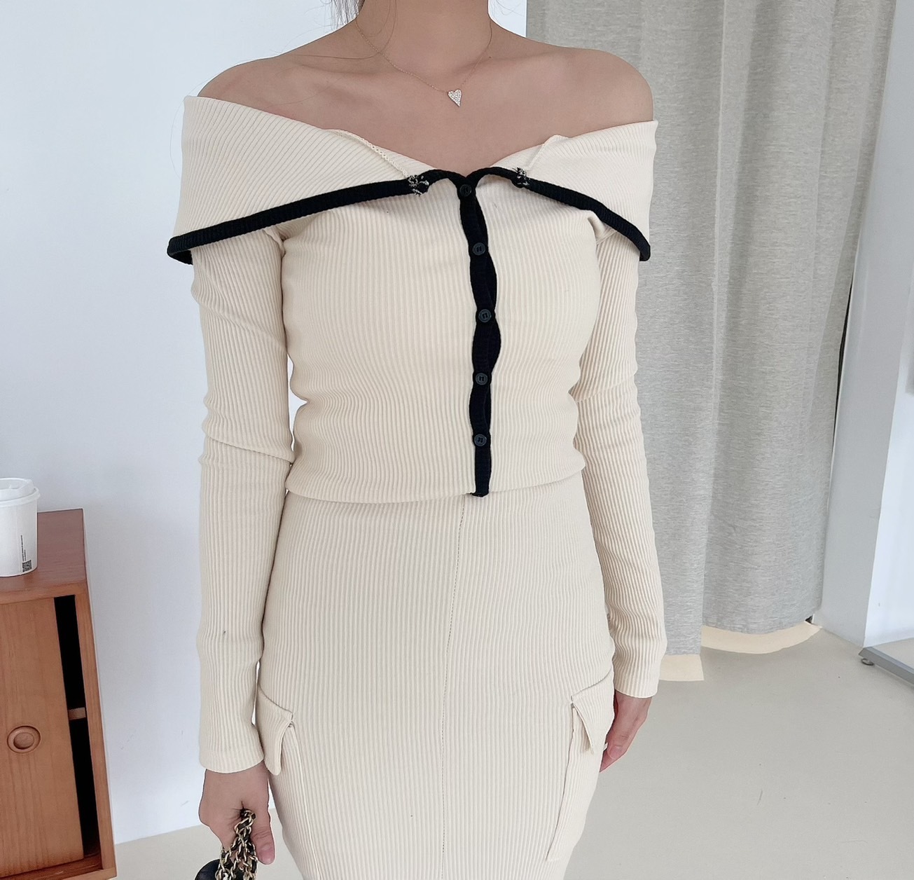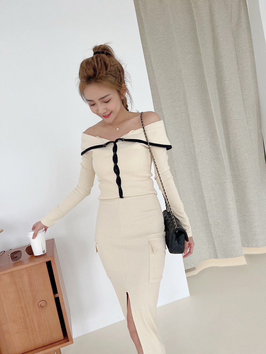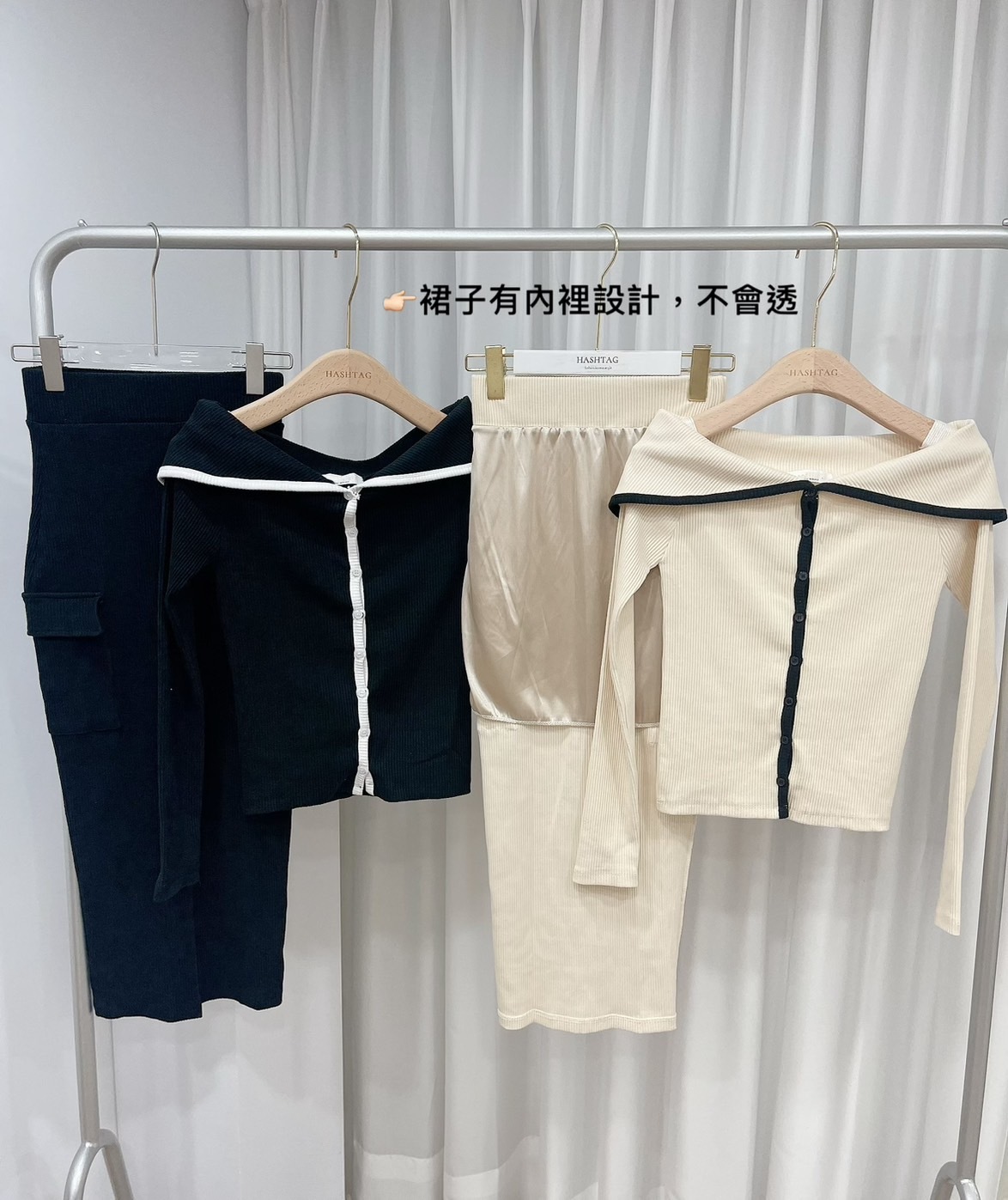 🔥03.22直播新品]💥氣質小姊姊]🇰🇷正韓超美撞色一字領上衣+前開叉半裙兩件式套裝 (米杏/兩色,可分開購買)