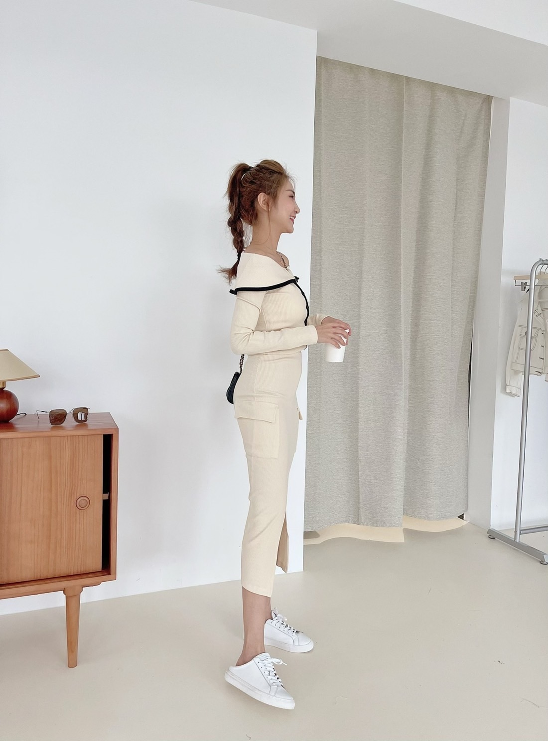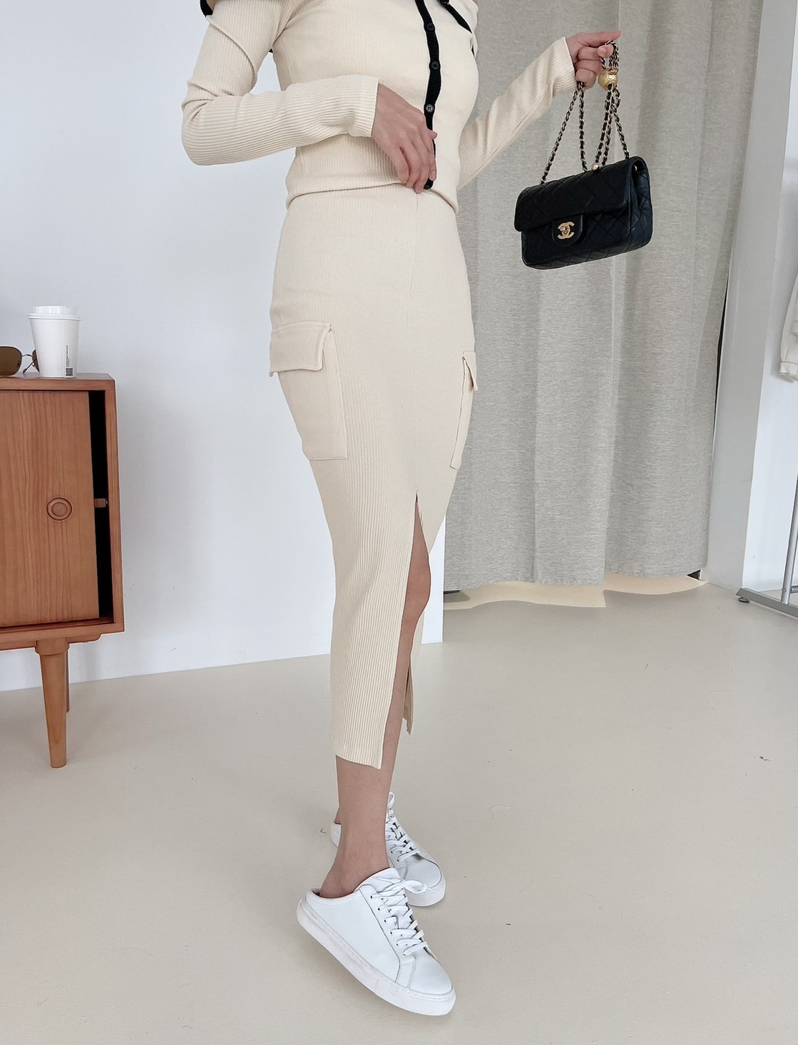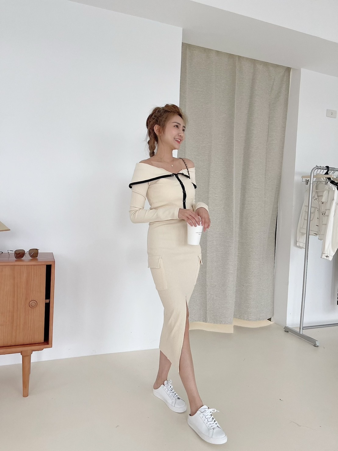 🔥03.22直播新品]💥氣質小姊姊]🇰🇷正韓超美撞色一字領上衣+前開叉半裙兩件式套裝 (米杏/兩色,可分開購買)