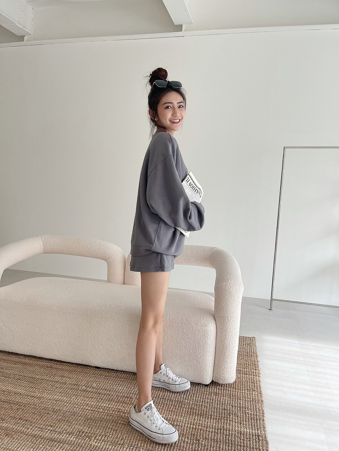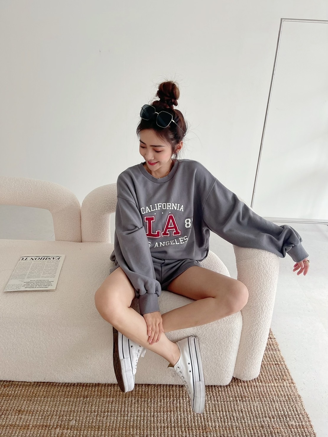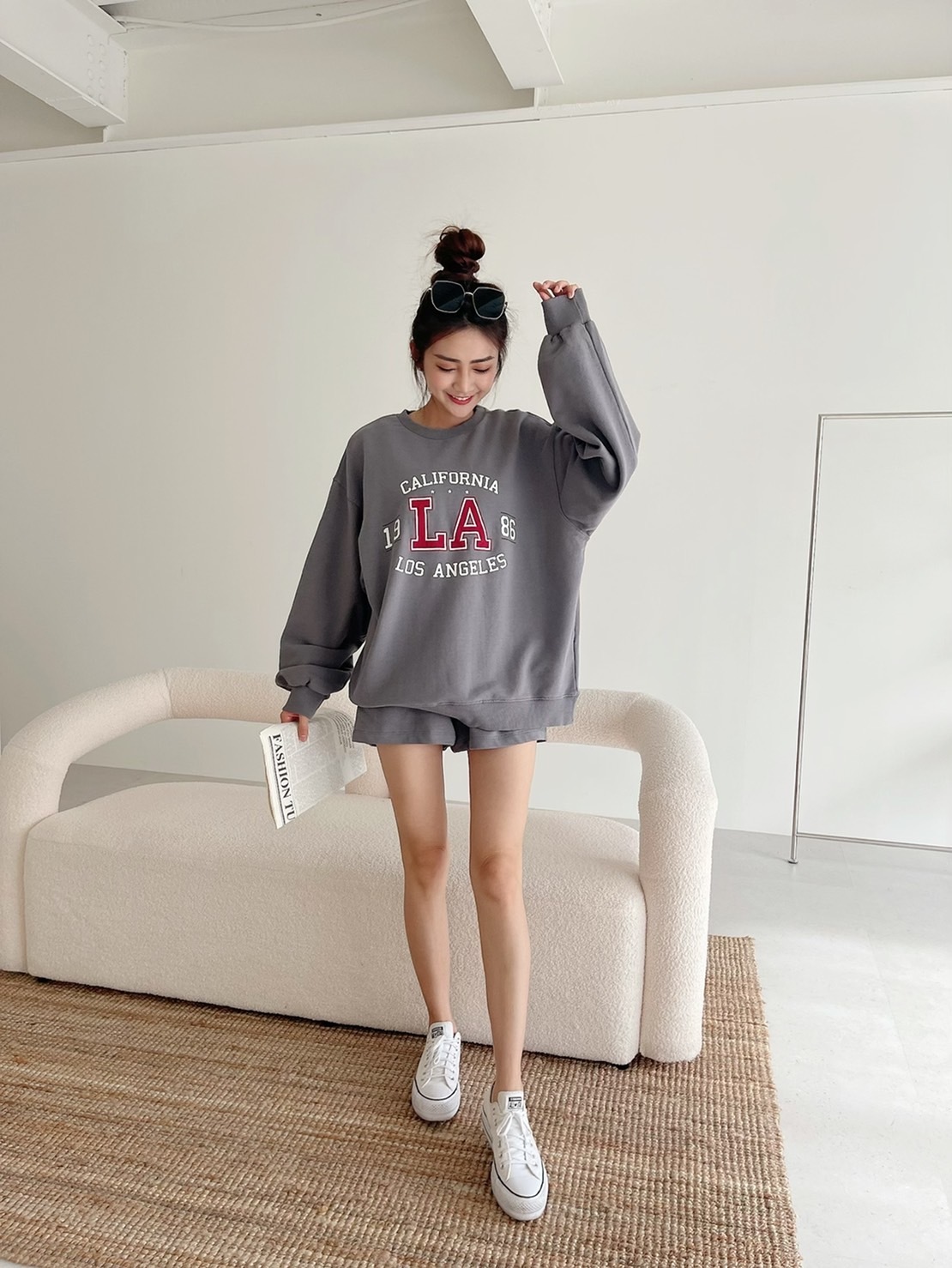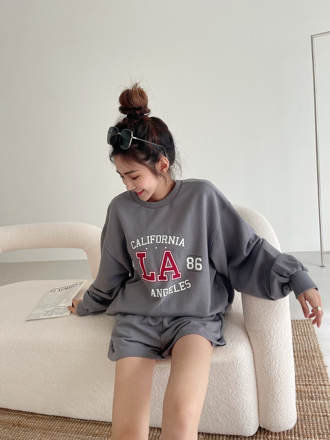 🔥04.06直播新品]😍小編ㄉ最愛]🇰🇷正韓美式休閒風刺繡英文字薄款大學t套裝(上衣+短褲,深灰/三色)