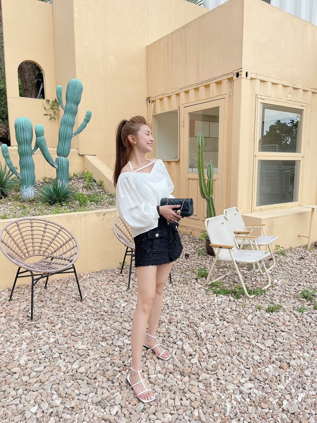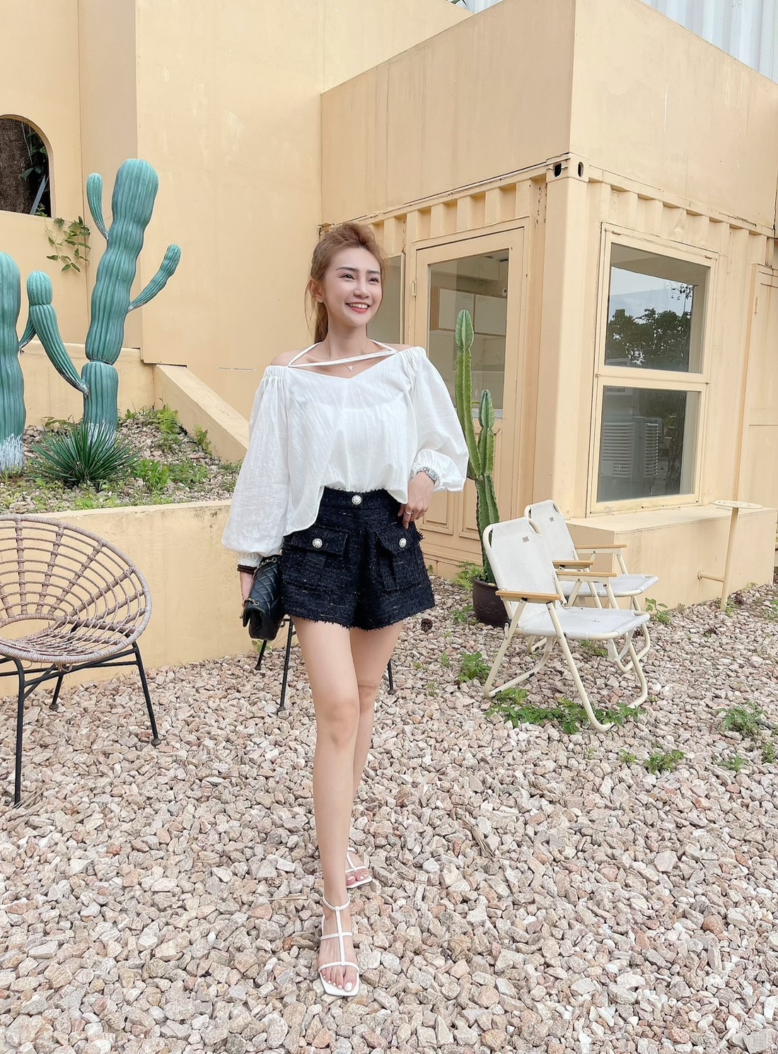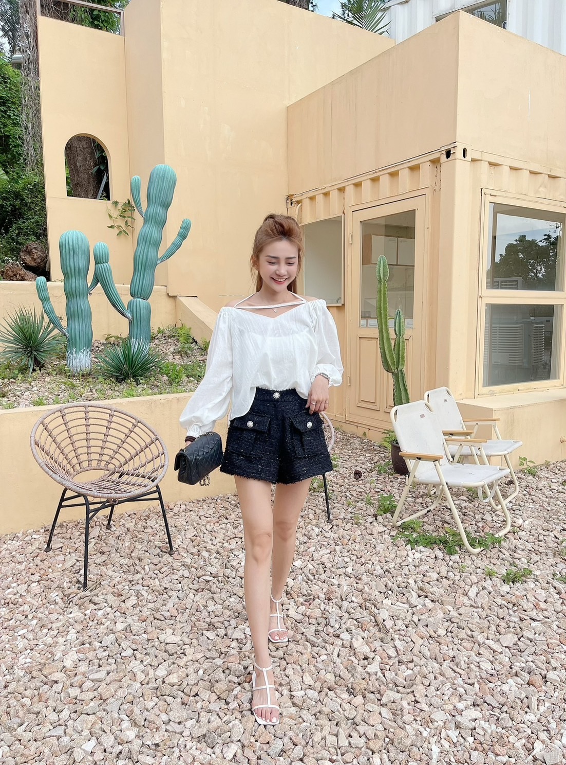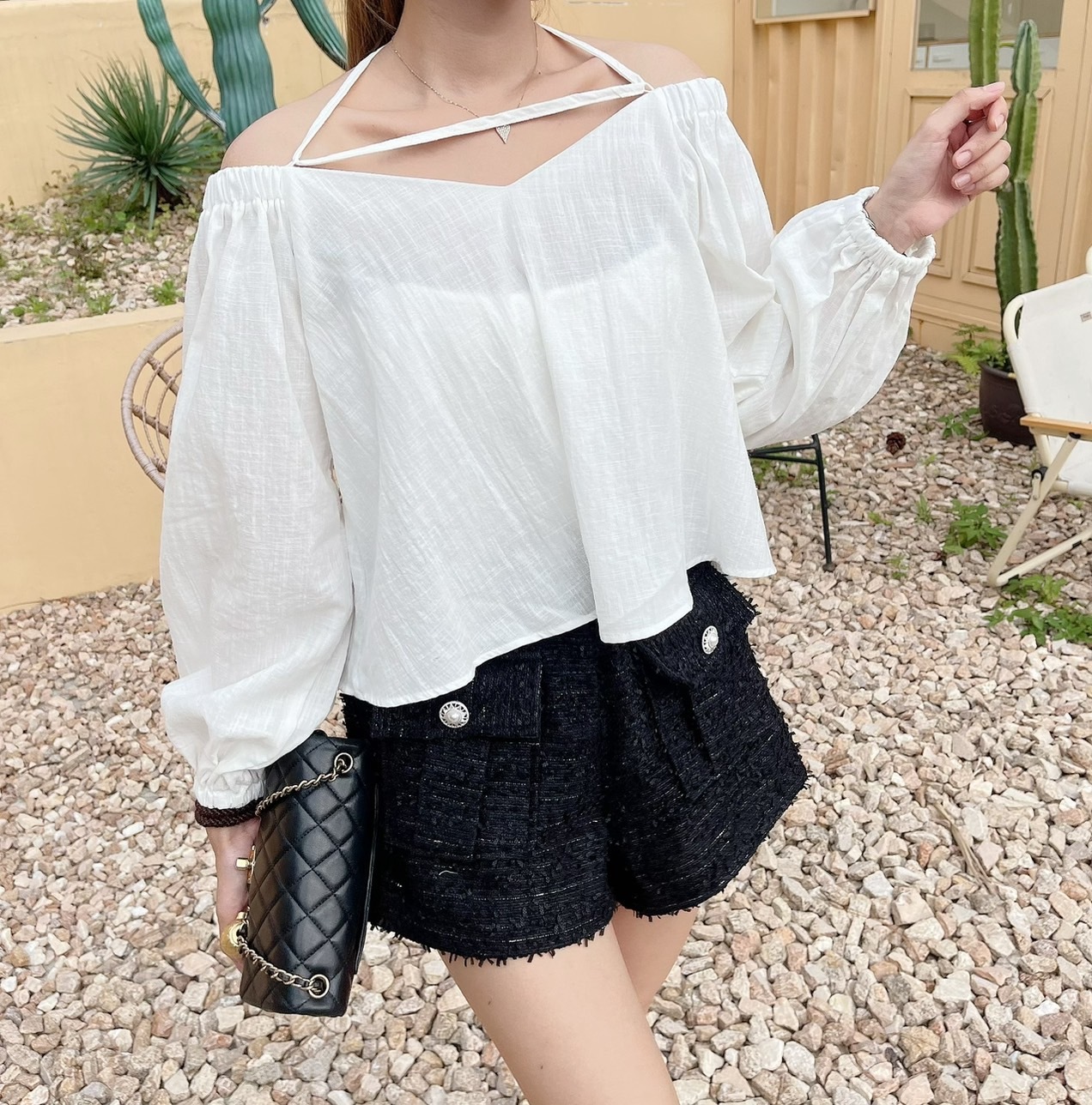 🔥06.07直播新品]💗美眉許願款]🇰🇷正韓兩穿綁脖薄款棉麻縮口袖上衣(繩子可拆下變一字領)