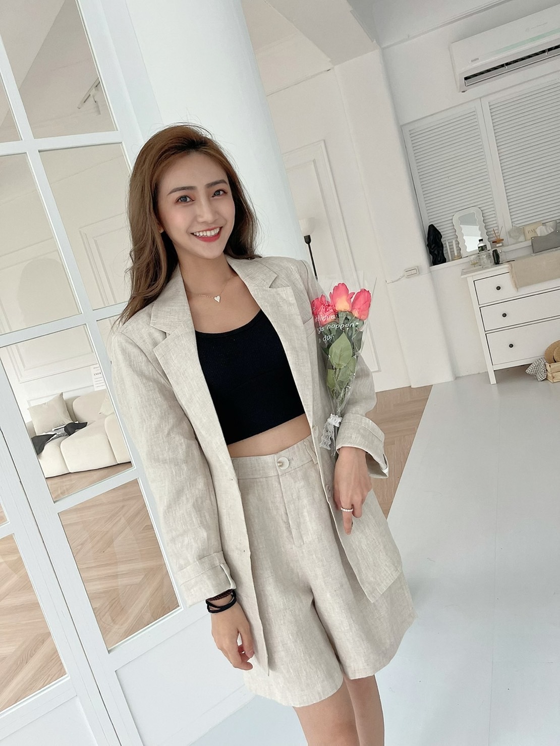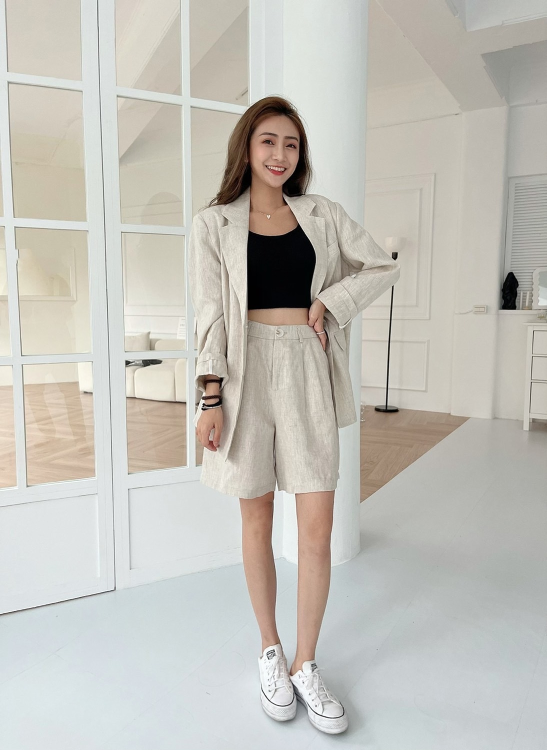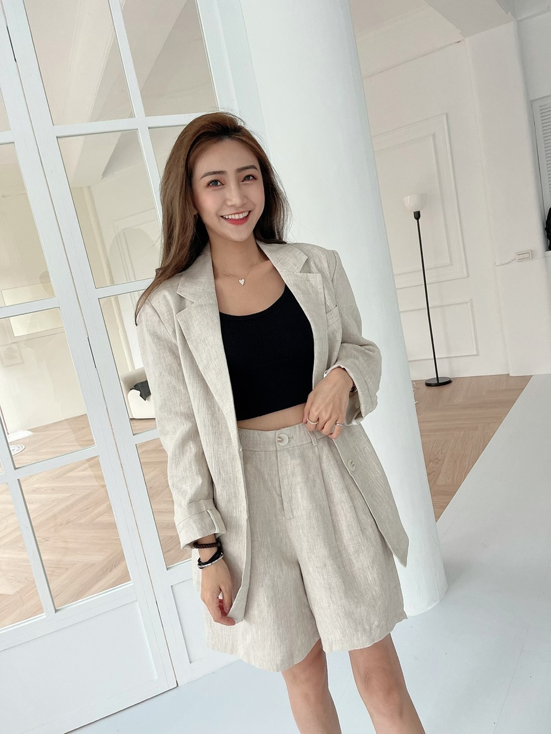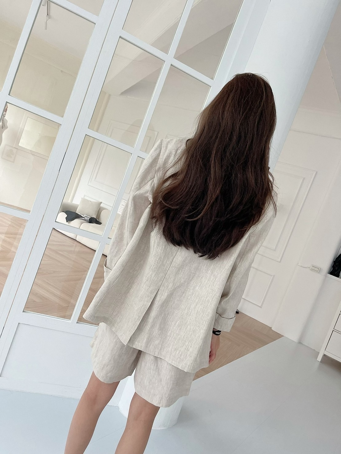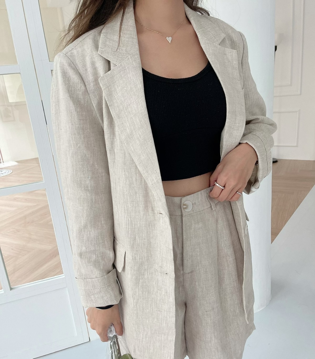 韓版超質感棉麻墊肩西裝外套+棉麻五分褲(燕麥杏/三色,限時套裝價)
