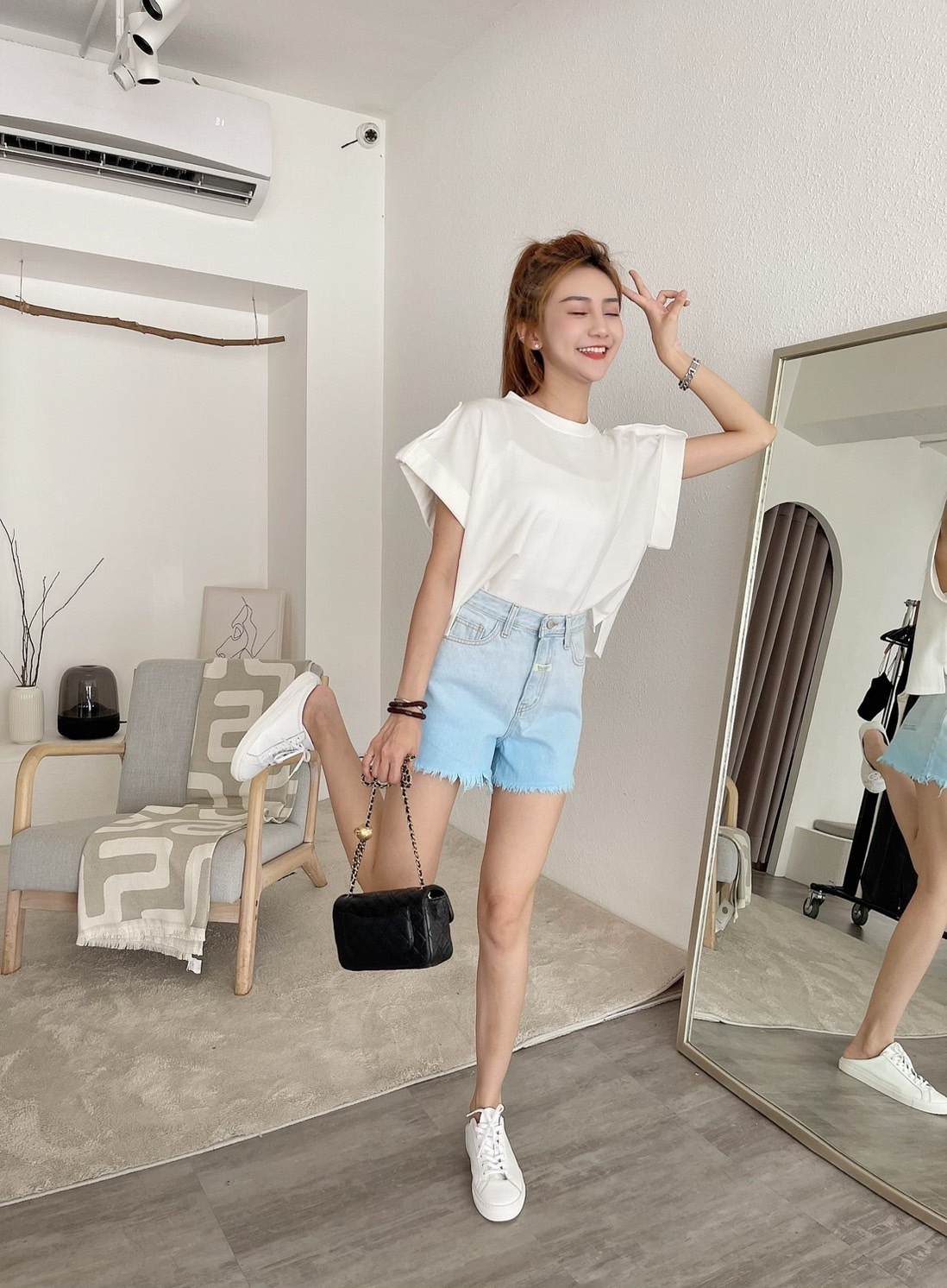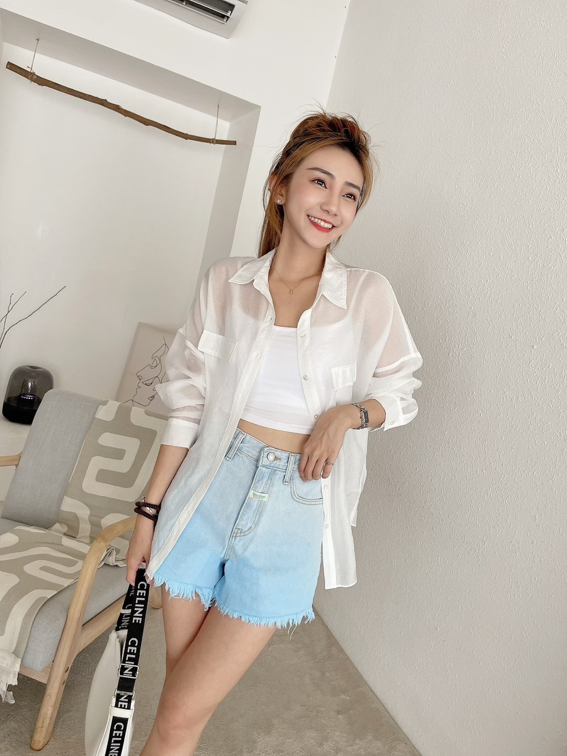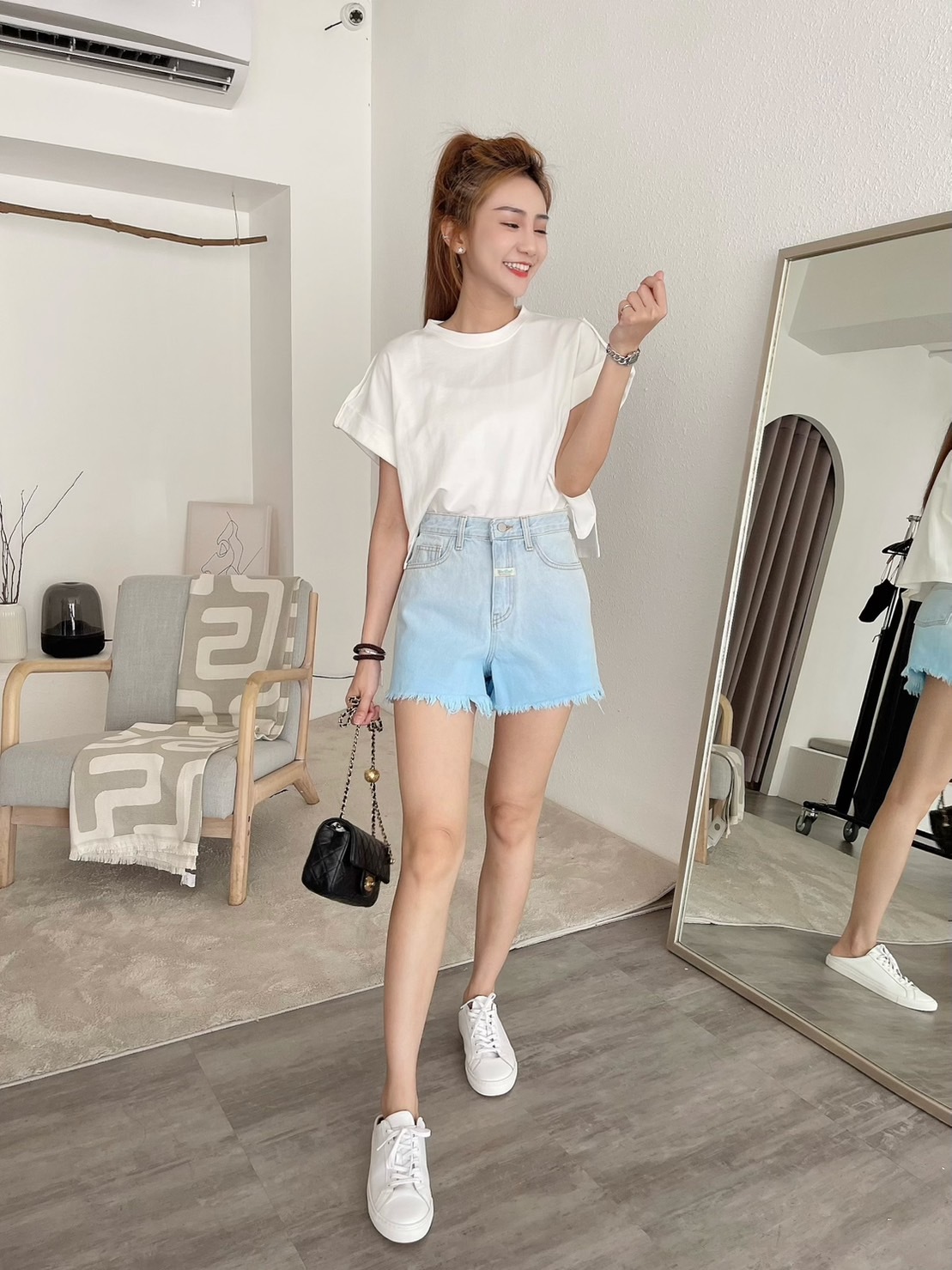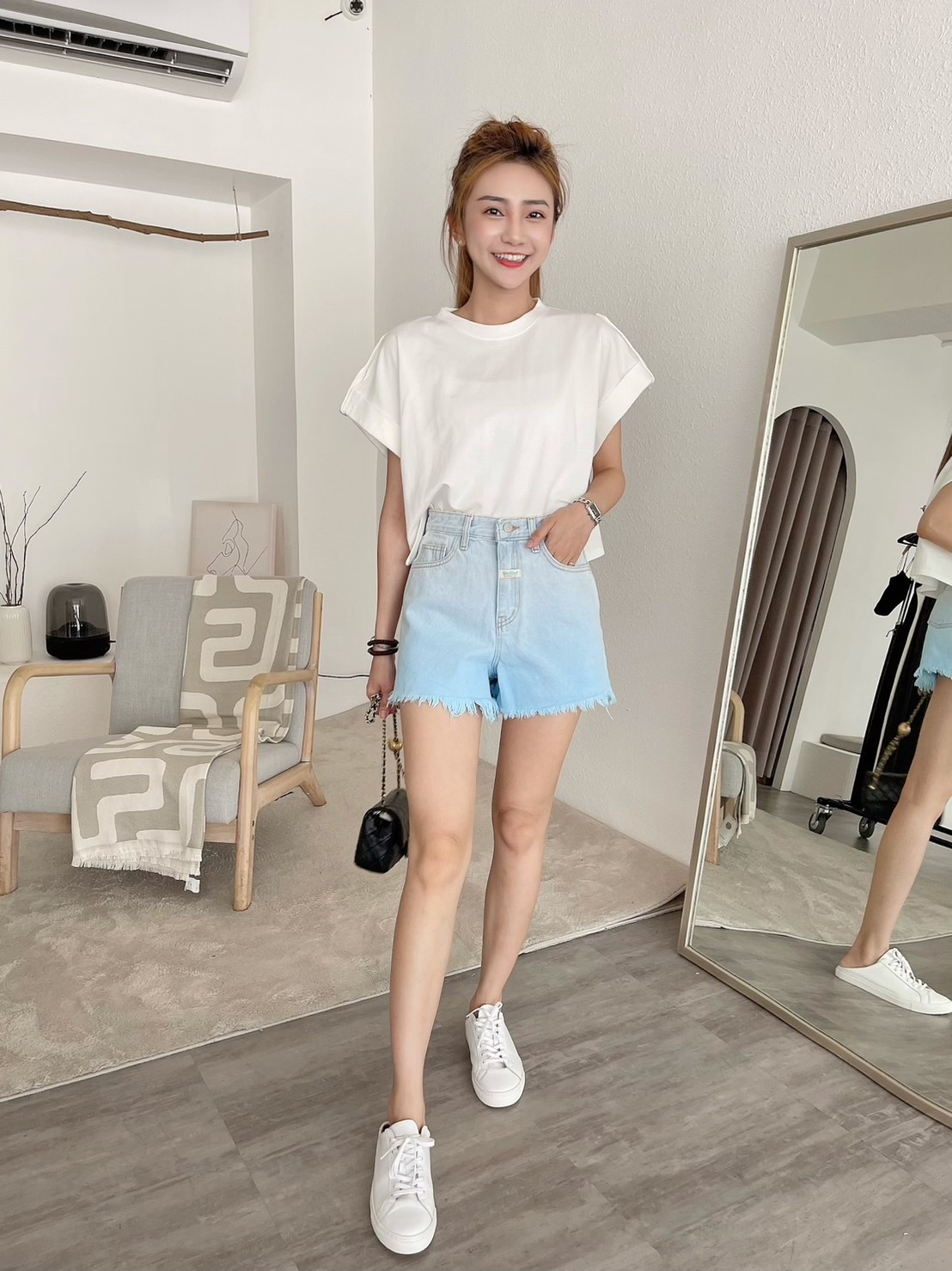 🔥07.26直播新品]💥最有特色ㄉ短褲]🇰🇷正韓中高腰超美手工漸層鬚邊牛仔短褲(S-L漸層藍/兩色)