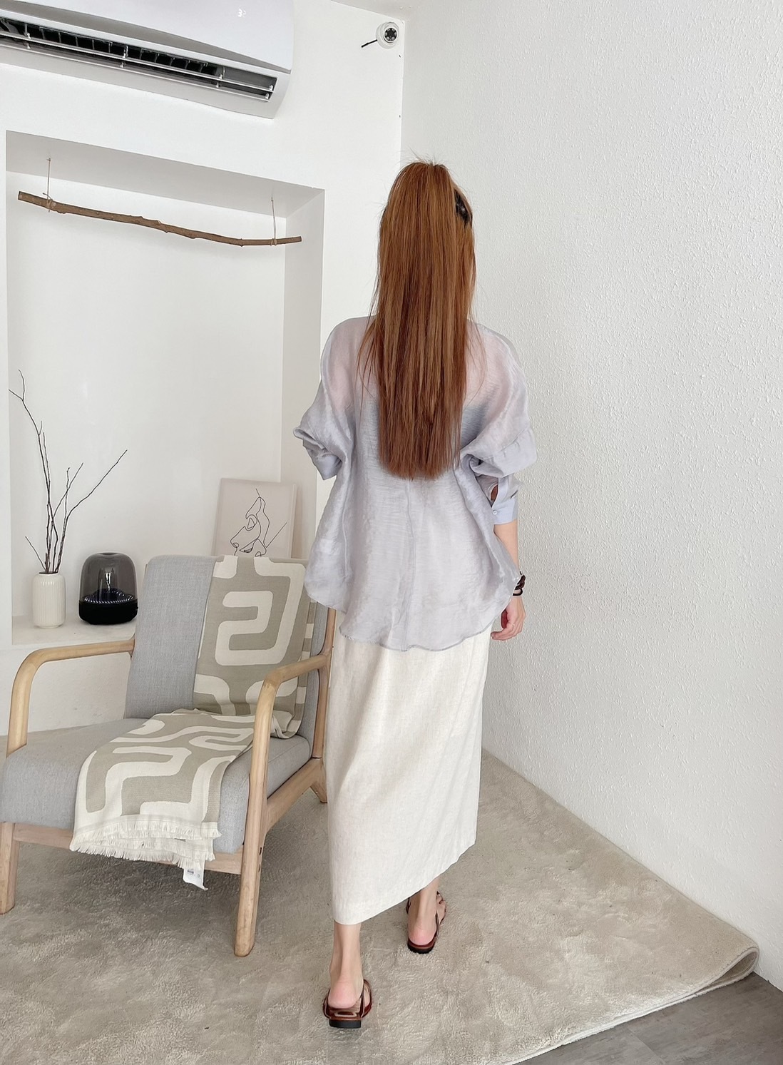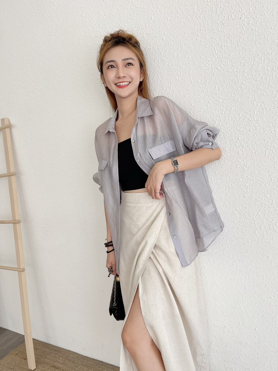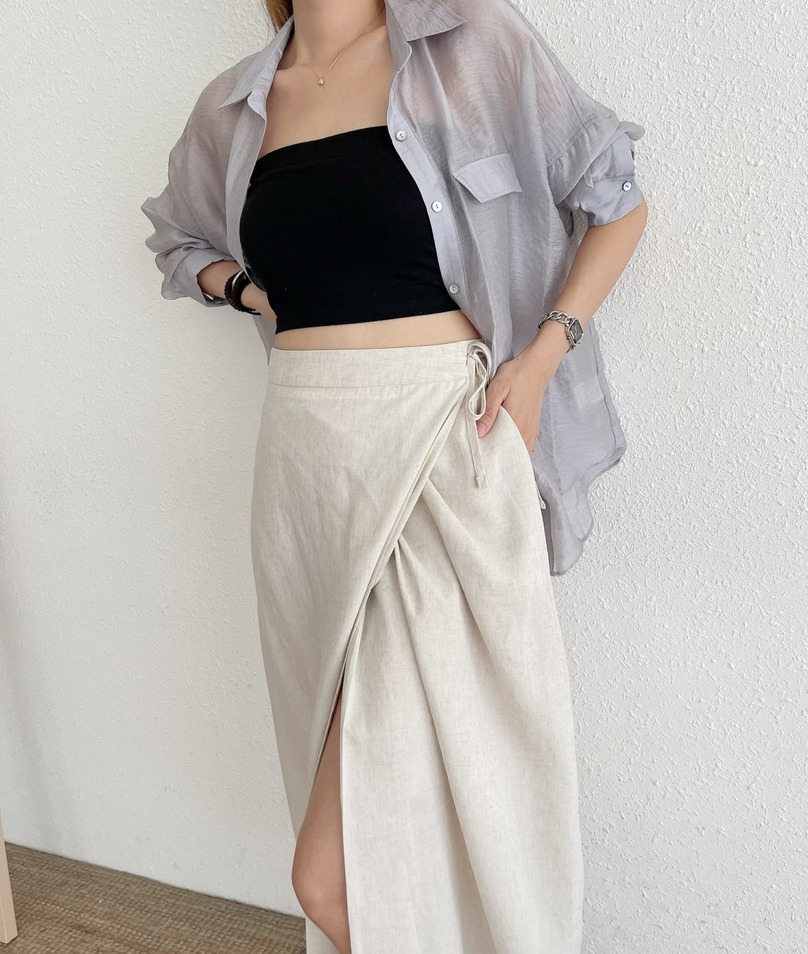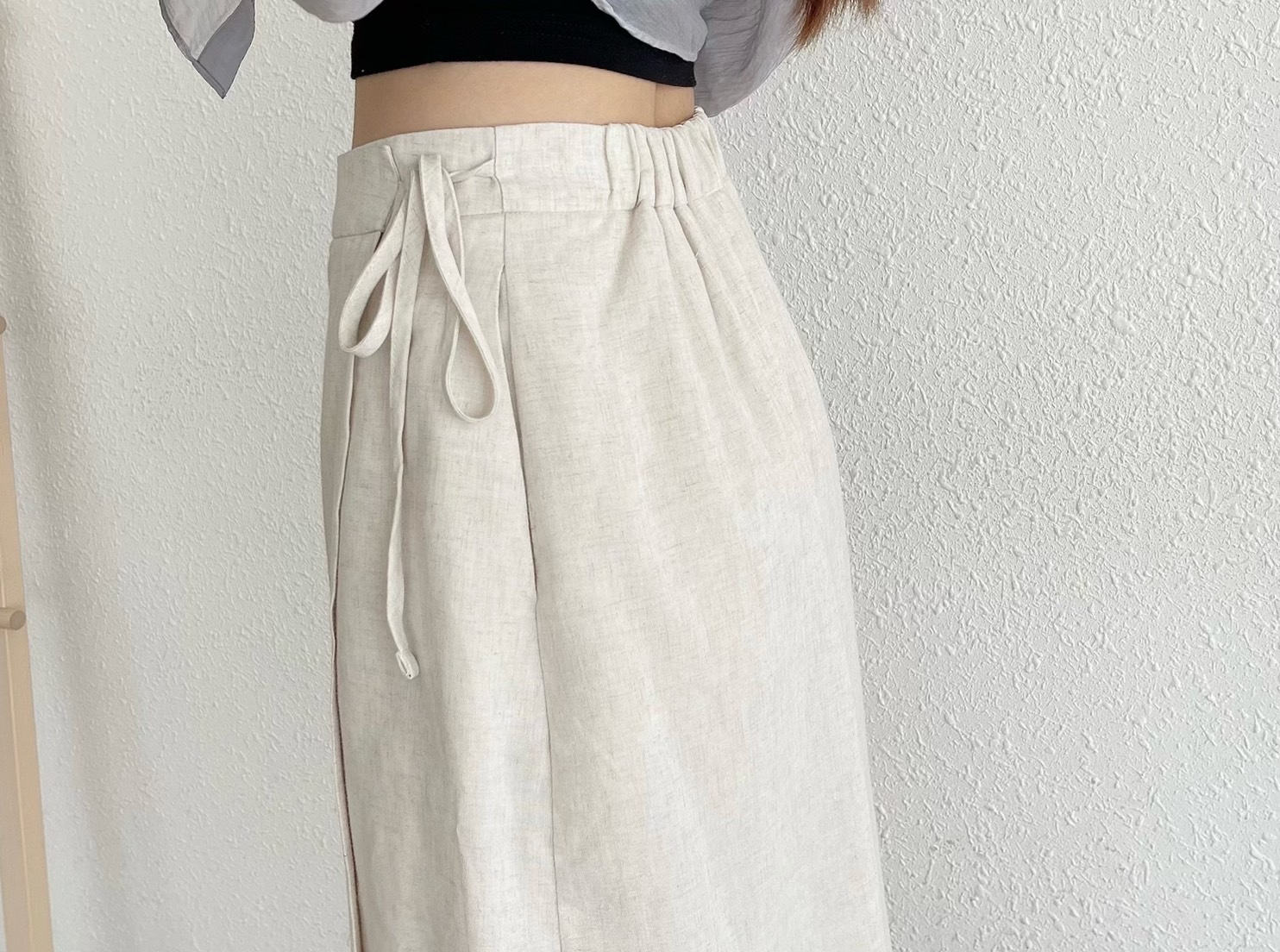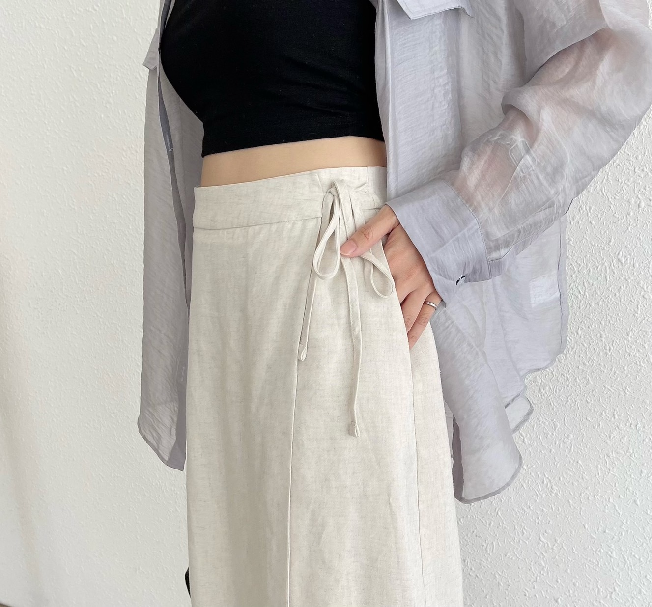 🔥07.26直播新品]💕度假氣質風]🇰🇷正韓高腰後鬆緊腰天絲亞麻柔軟側綁帶一片式半裙(有口袋/燕麥米/兩色)