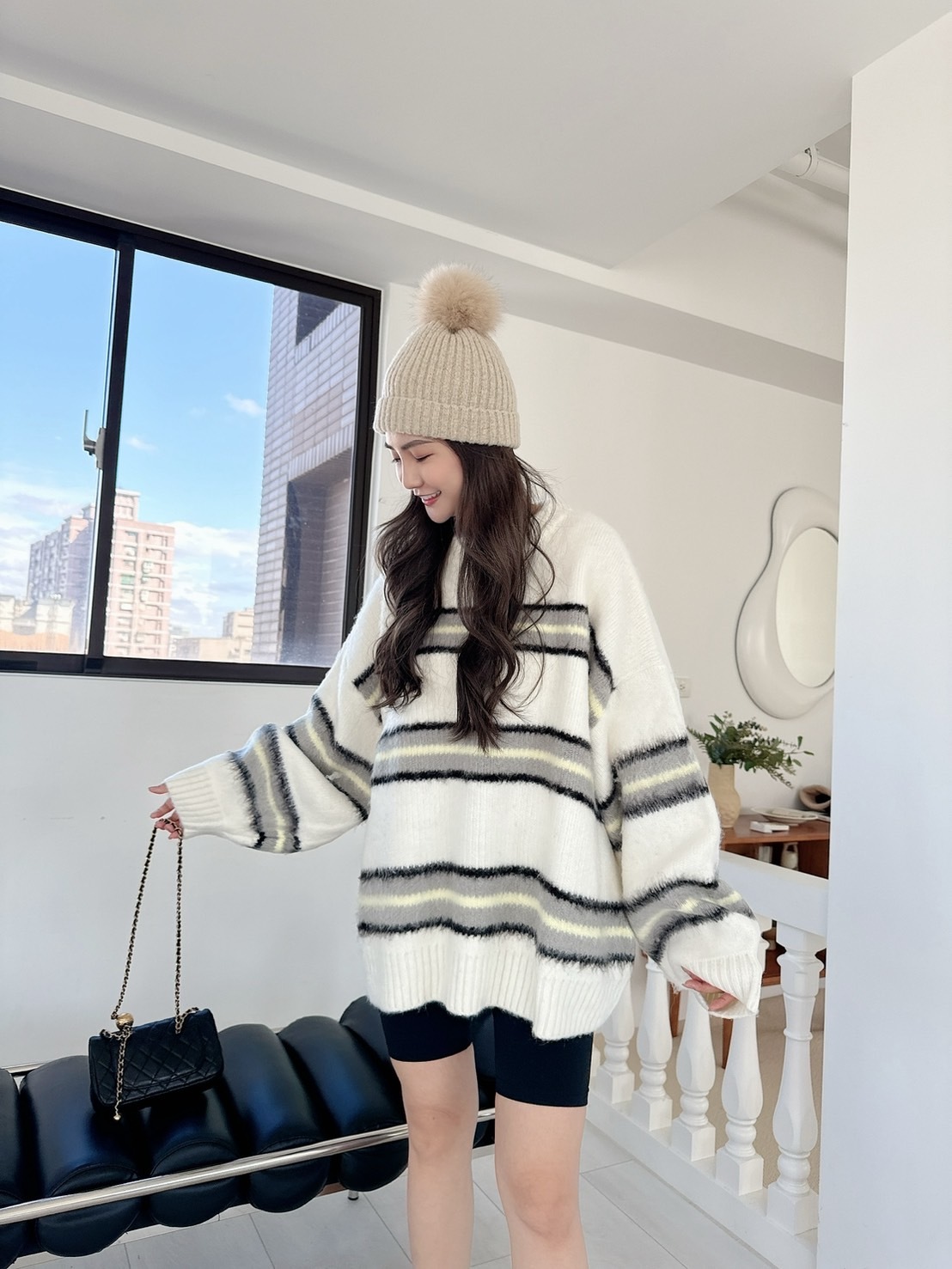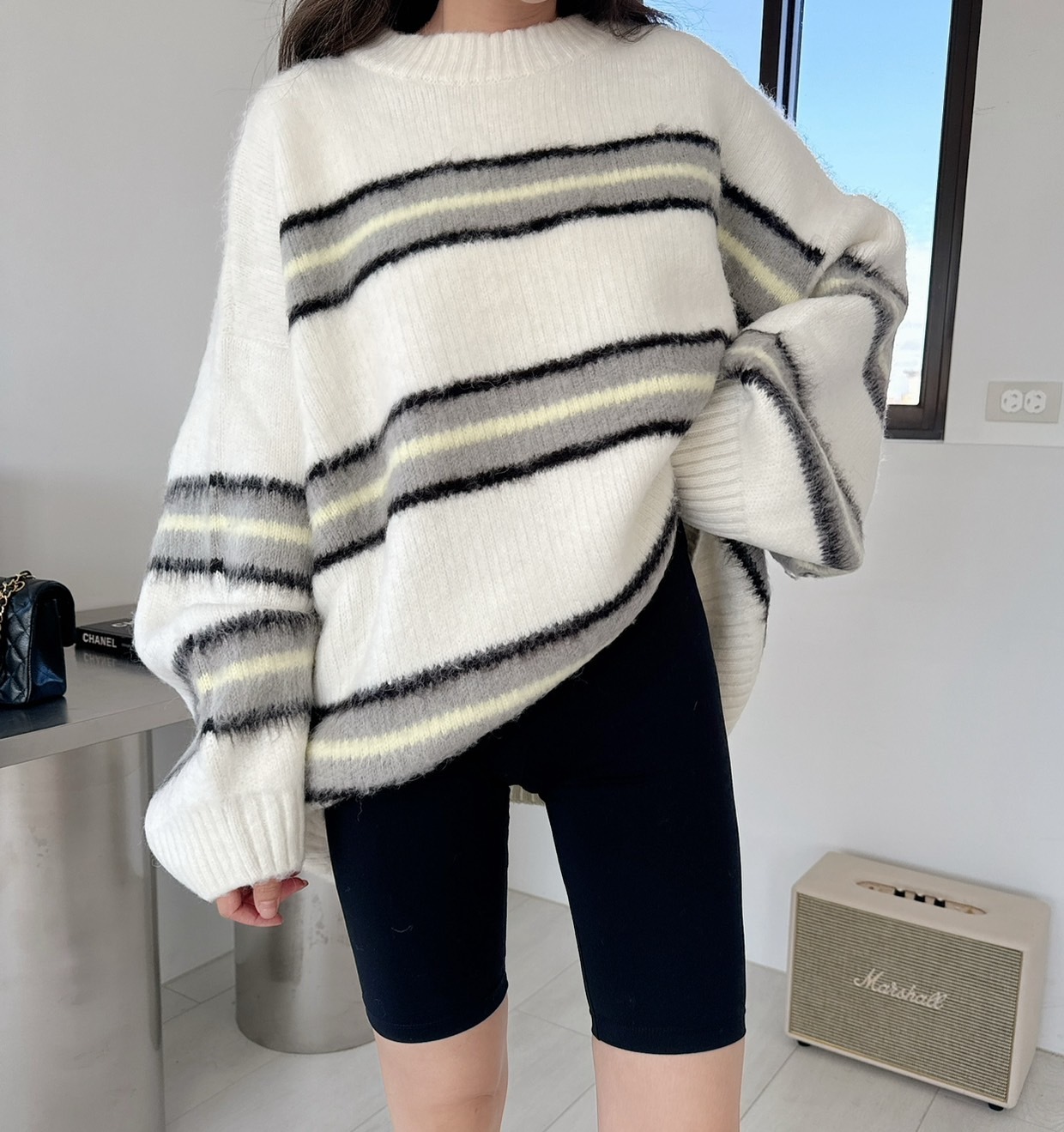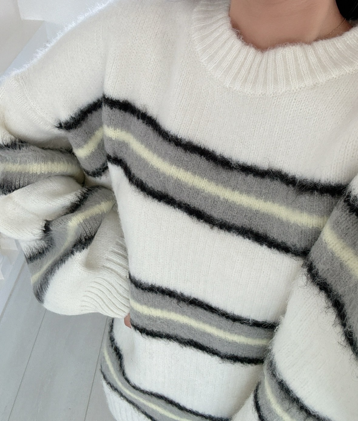 【預購】🔥12.04秋冬新品]💥闆娘自留款]🇰🇷正韓圓領高磅彩色條紋寬鬆毛衣(可愛白/兩色)